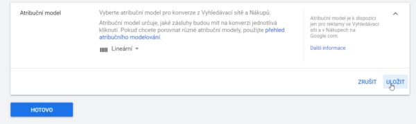 Výchozí atribuční model je Poslední proklik. Ten ale výsledky značně zkresluje. Osobně tedy využívám atribuční model Lineární. U konverze jej změníte takto:
