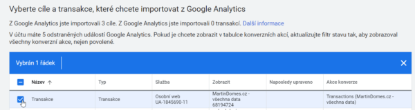 6. Zaškrtněte ty konverze, které chcete importovat do Ads. Vyberte jen ty, které jsou relevantní k vašim cílům. A pokud zvolíte konverzi Transakce (tedy nákupy z eshopu z měření elektronického obchodu), pak nezaškrtávejte cíl, který je shodný (jeho název může být například Nákup v eshopu apod.), protože by se vám konverze zdvojily.