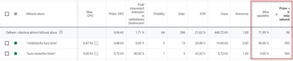 V Google Ads můžete v tabulkách vidět metriky z Analytics. Jde o metriky Délka návštěvy, Míra okamžitého opuštěníPočet stránek za návštěvu. Nemusíte se tak přepínat mezi aplikacemi, abyste analyzovali návštěvnost z klíčového slova či reklamy. K tomu ovšem potřebujete mít obě aplikace propojené.