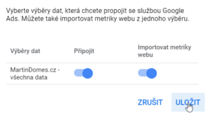 5. Oba přepínače PřipojitImportovat metriky z webu přepněte do zapnuté polohy a klikněte na Uložit.