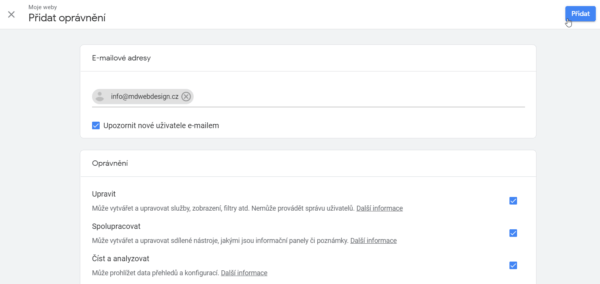 5. Napište e-mailovou adresu, s níž se přihlašujete do Ads, a zaškrtněte oprávnění pro úpravy.