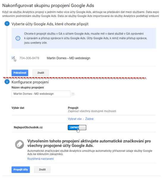 4. Na stránce Nakonfigurovat skupinu propojení Google Ads byste měli vidět svůj účet Google Ads. Ověřte si jeho číslo přímo v Google Ads (vpravo nahoře). Vybraný účet Ads zaškrtněte a klikněte na tlačítko Pokračovat.
