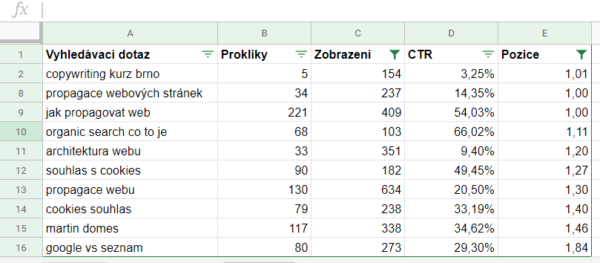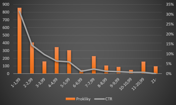 Celkově tedy lze říct, že v případě mého webu počet prokliků i míra prokliků s nižší pozicí postupně klesají. A první pozice zajišťuje největší počet prokliků i míru prokliků.