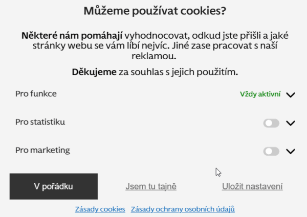 Jedině technické (nezbytně nutné) soubory cookie jsou předem zaškrtnuté a tento stav by nemělo být možné změnit. Ostatně jsou nutné pro provoz webu.