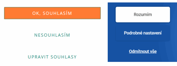 Aby měl návštěvník možnost svobodné volby, musí být odmítnutí souhlasu stejně jednoduché jako jeho udělení. Tlačítka pro souhlas i odmítnutí je třeba mít na stejné úrovni cookie lišty. Tedy vedle sebe.