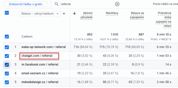 Odkazy z chatbotů se v Analytics označují jako odkazy z jiných webů, tedy s médiem referral. To je vlastně stejná kategorie jako třeba odkazy z Facebooku nebo jiných externích webů.