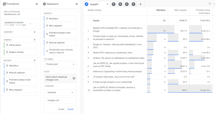 Máte hotovo! Teď vidíte návštěvnost z ChatGPT s přehledem vstupních stránek na vašem webu.