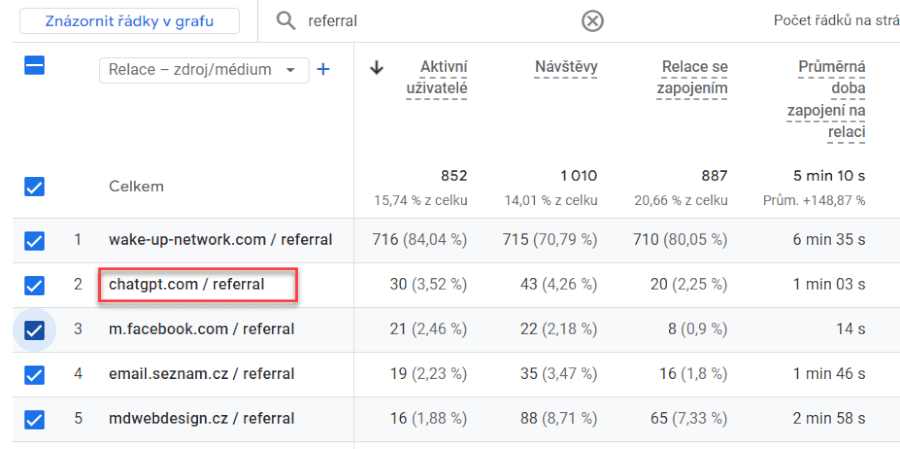 Odkazy z chatbotů se v Analytics označují jako odkazy z jiných webů, tedy s médiem referral. To je vlastně stejná kategorie jako třeba odkazy z Facebooku nebo jiných externích webů.