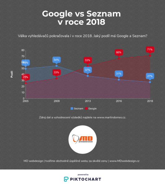 Podívejte se na vývoj podílu vyhledávačů Google a Seznam od roku 2005 do roku 2018.