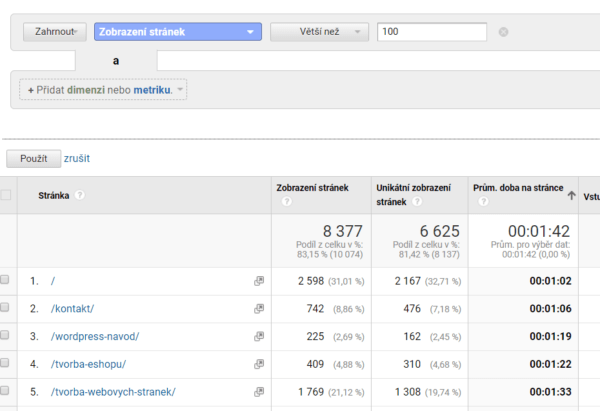 Stejným způsobem můžete seřadit stránky podle Procenta odchodů, nebo Míry okamžitého opuštění. Stačí kliknout na záhlaví sloupce.