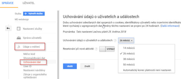 Jestliže osobní údaje prokazatelně sbíráte a nemůžete nastavit neomezenou dobu, doporučuji nastavit co nejdelší dobu. Po této době totiž statistické údaje nebudou k dispozici a některé přehledy v Analytics budou značně zkreslené.