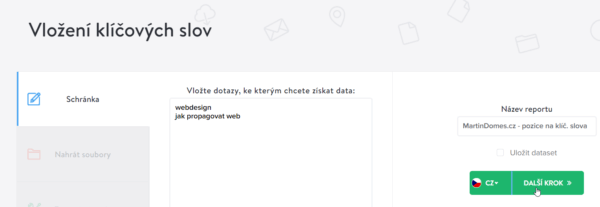 3. Na záložce schránka napište až 5 hledacích frází, vpravo vyplňte pole Název reportu a klikněte na tlačítko Další krok.