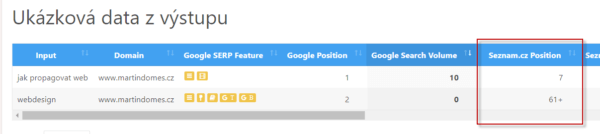 Jakmile bude report zpracovaný, sjeďte v něm dolů až k tabulce. V ní najdete pozice jak v Googlu, tak v Seznamu – rolujte směrem doprava a hledejte sloupec Seznam.cz Position.