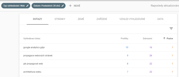 4. Níže na záložce Dotazy najdete všechny hledací dotazy, na které se váš web zobrazil. Sloupec Pozice zobrazuje průměrnou pozici za dané časové období. Když kliknete na jeho název, změní se řazení dotazů.