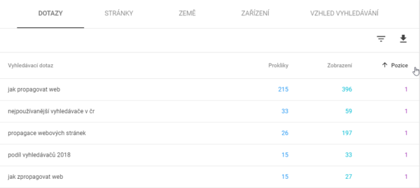 Pokud například chcete zjistit, na jaké výrazy se váš web zobrazuje na prvních pozicích, klikněte na Pozice: