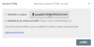 Pokud netušíte, o čem mluvím, pak soubor pošlete správci svého webu a požádejte o uložení jeho. Jakmile jej uloží na své místo, vraťte se do Search Console a dokončete ověření.