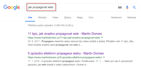 Jak vidíte na obrázku, na frázi jak propagovat web se můj blog zobrazuje na první pozici. Tak se podívejme do vyhledávače Google, jak tento výsledek vyhledávání vypadá v praxi: