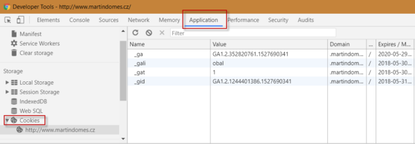 Zjistit, jaké soubory cookie váš web používá, můžete například v prohlížeči Chrome takto: