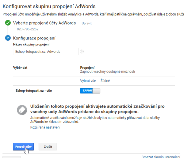 A dále je třeba propojit Analytics s Adwords (je třeba mít založený účet Adwords):
