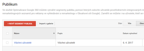 Ve Správci v Google Analytics v části Služba klikněte na Definice publika a poté na Publikum. Jak vidíte, Analytics už vám vytvořil první segment publika, a to Všichni uživatelé.