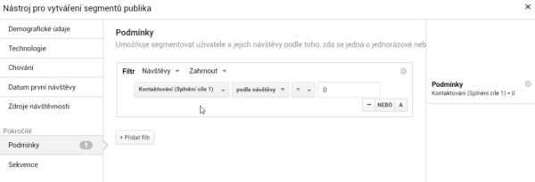 TIP: Pokud chcete vytvořit segment publika, které nenakoupilo v e-shopu, v prvním kroku zvolte šablonu Uživatelé, kteří dokončili transakci. A v nastavení podmínky změňte znaménko na rovnítko = Transakce podle návštěv = 0.