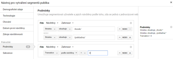 V tomto postupu vytvoříte segment návštěvníků e-shopu, kteří sice vložili zboží do košíku, došli, ale před dokončením objednávky odešli. Podmínku zaměříte jak na košík, tak na pokladnu, protože některé e-shopy umožňují vstoupit rovnou na stránku pokladny a vynechat stránku s košíkem.