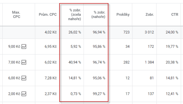 Na jaké pozici se inzerát průměrně zobrazil, si snadno ověříte pomocí metrik: