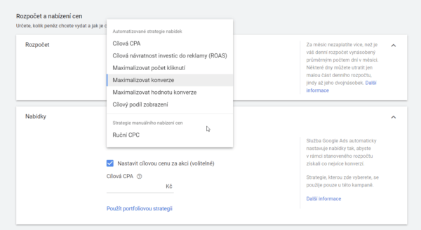 POZOR: Pokud chcete používat automatickou strategii, musíte na svém webu/eshopu měřit konverze v Google Analytics a posílat je do Google Ads.